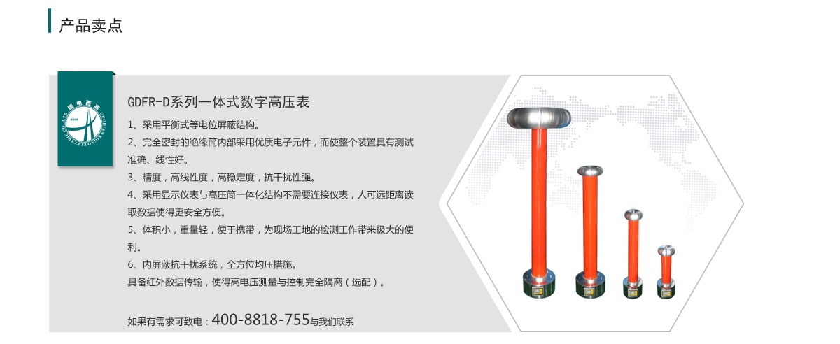 GDFR-D型系列数字高压表(分压器)采用阻容式分压器和高阻数字表一体化设计,实现高压测量与显示,客户可根据所测量电压精度要求,来选择不同的准确度。该系列最高准确度分别为:AC:0.5% DC:0.5%,若需更高准确度,可选择我公司的高精度、高稳定度的交流校验标准和直流校验标准;采用电位屏蔽式高压测量装置,是我公司最新研发的产品,与其他公司同类产品相比,国电西高采用美国进口的填充介质,内部采用多种专利屏蔽技术,使该系列产品有更长的使用寿命和更高的稳定性,在该领域拥有绝大部分的市场占用量和市场美誉度。