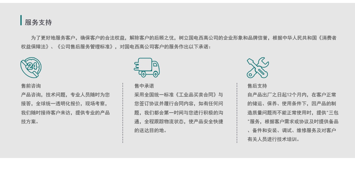 自产品出厂之日起12个月内,在客户正常 的储运、保养、使用条件下,因产品的制 造质量问题而不能正常使用时,提供"三包 "服务,根据客户需求或协议及时提供备品 、备件和安装、调试、维修服务及对客户 有关人员进行技术培训。