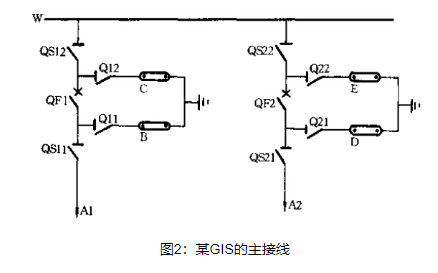 例如,测量图2所示GIS的主同路电阻时,可以首先测量A1——A2之间的电阻,若三相测量数据与出厂数据差别较大或三相数据差别较大,应对测量回路分段,以找到有安装缺陷的部件。如从B、C两点通电测量,可以判断断路器QF1的接触情况;从D、F两点通电测量回路电阻,可以准确判断断路器QF2的接触情况。