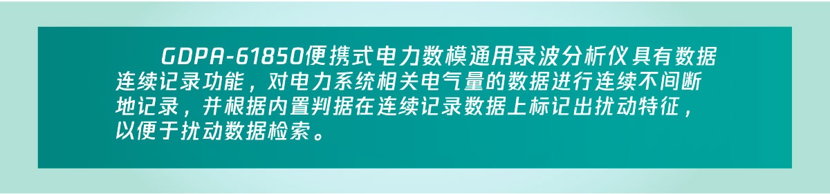 GDPA-61850便携式电力数模通用录波分析仪(以下简称GDPA-61850)可直接接入智能变电站过程层网络的DL/T 860-9-2、GOOSE、IEEE 1588对时报文,当电力系统故障时,启动暂态故障录波,记录系统的一次电压电流波形以及二次设备的动作行为,实现电力系统故障分析与故障测距定位。GDPA-61850还具有数据连续记录功能,对电力系统相关电气量的数据进行连续不间断地记录,并根据内置判据在连续记录数据上标记出扰动特征,以便于扰动数据检索。