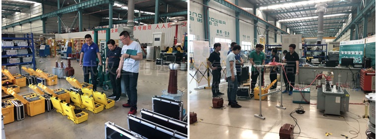 考察过程中,客户一行人对我们的研发中心、设备展区、生产车间、电力设备试验区等都一一参观了解。同时,在电力设备试验区对具备模式演示条件的四级承试资质设备为客户亲自演示了相关试验操作。