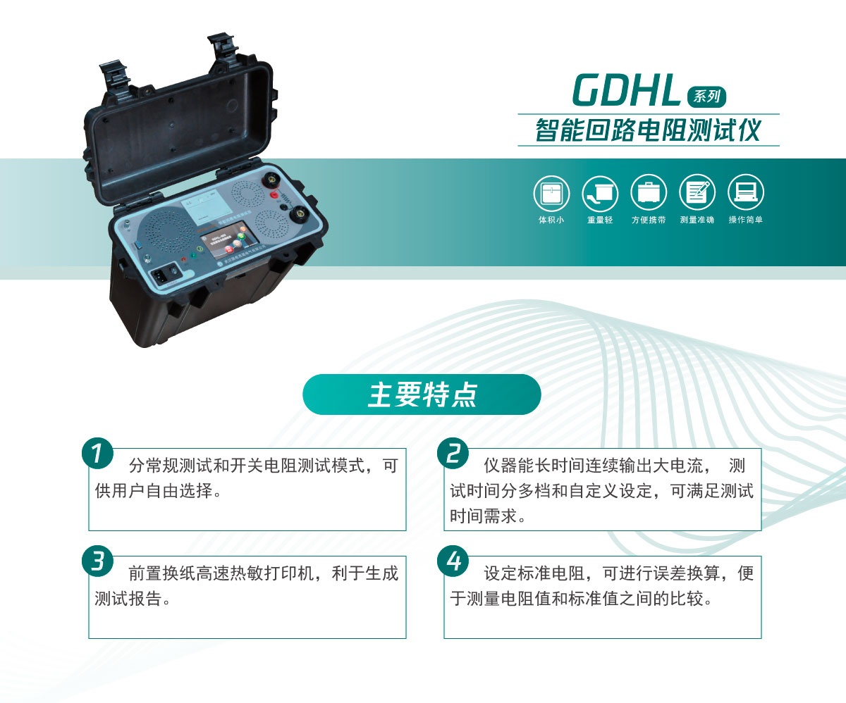GDHL系列智能回路电阻测试仪采用先进的大功率开关电源技术和先进的电子线路精制而成。是高压、中压以及低压断路器、开关回路电阻、大电流汇流排(如铜排、铝排等)连接点电阻、套管连接处的接点电阻、电缆连接点电阻以及焊接点处电阻等的专用测试仪器。电阻值的测量电流采用国家标准GB736所推荐的不小于100A电流。本仪器具有体积小、重量轻、抗干扰能力强、精度高、操作方便、保护功能完善等特点。