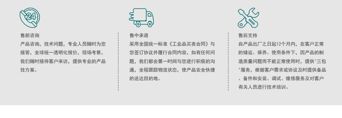 自产品出厂之日起12个月内,在客户正常 的储运、保养、使用条件下,因产品的制 造质量问题而不能正常使用时,提供"三包 "服务,根据客户需求或协议及时提供备品 、备件和安装、调试、维修服务及对客户 有关人员进行技术培训。