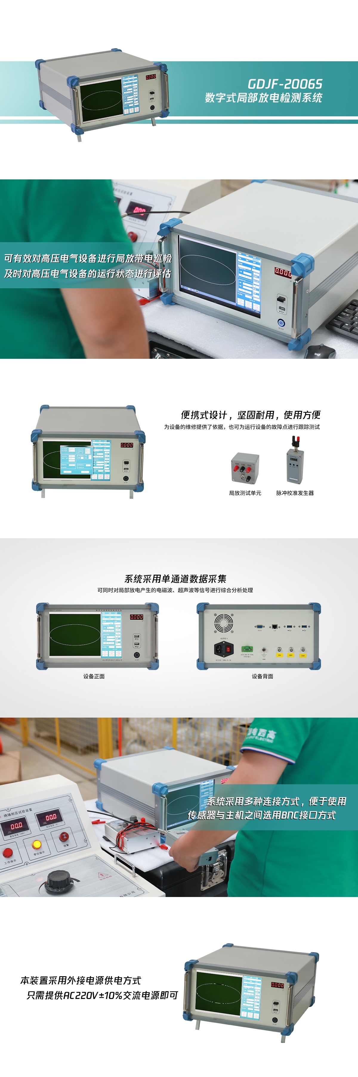 具备对运行中的高压电气设备进行局放带电巡检的功能,适用于柱上开关、互感器、干式变压器、油浸式变压器、高压断路器、耦合电容器、电抗器、电容套管、高压开关等试品进行局部放电实验及其他科学实验研究。