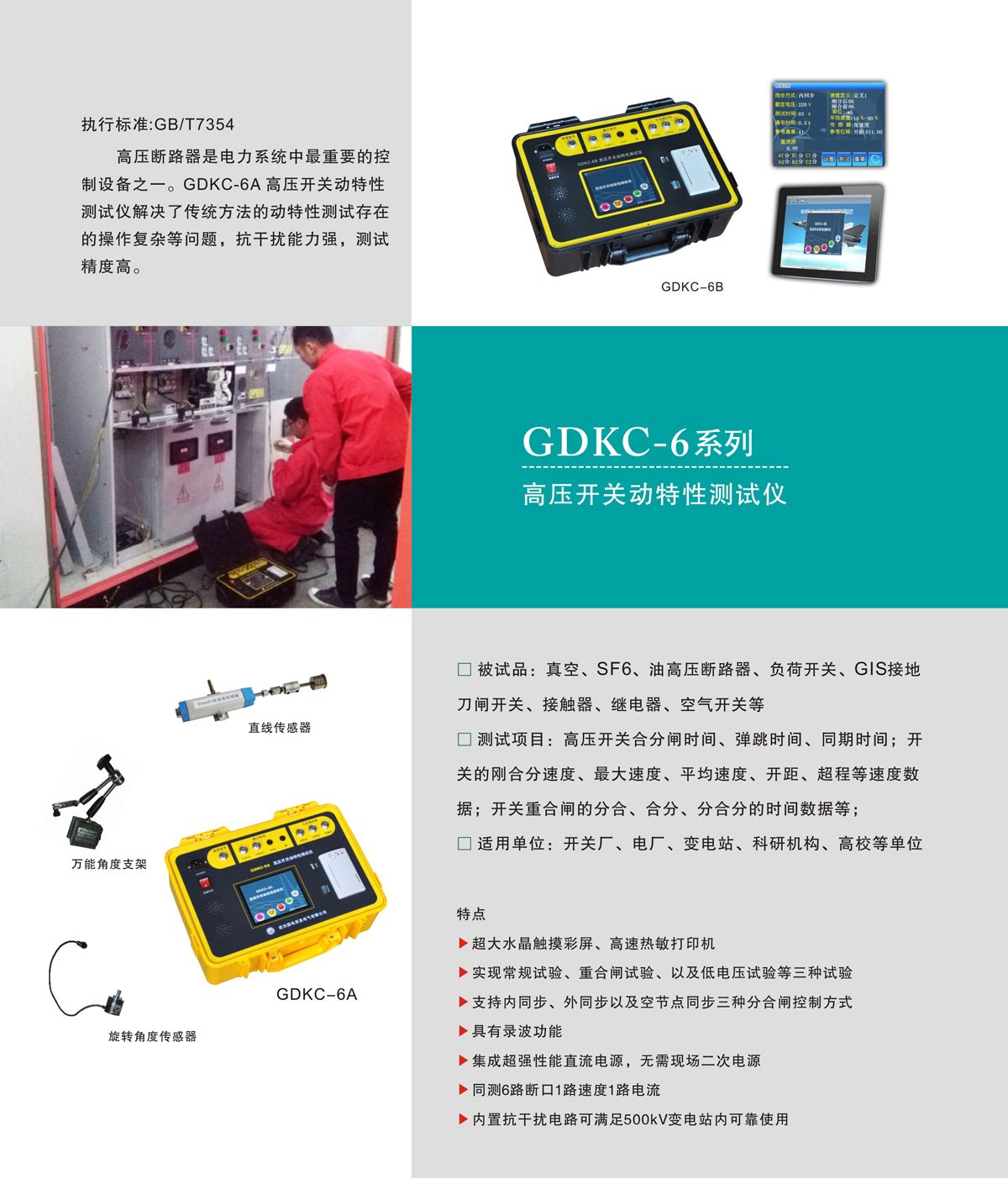 高压断路器是电力系统中最重要的控制设备之一。电网中高压断路器的运行数量最多,运行条件和技术要求比较复杂,其运行可靠性不仅关系到高压断路器本身,而且影响到其它设备乃至整个电网。因此,对高压断路器的动特性进行测试是一项很重要的工作。GDKC-6型高压开关动特性测试仪解决了传统方法的动特性测试存在的操作复杂等问题,具有抗干扰能力强,测试精度高的特性。
