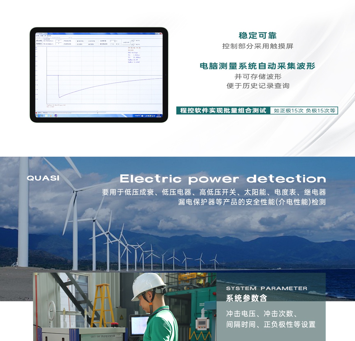 GDCY-30P型程控自动冲击电压试验仪主要是根据TB/T 2653、GB/T17627、GB/T16927等标准要求,主要用于低压成套、低压电器、高低压开关、太阳能、电度表、继电器、漏电保护器等产品的安全性能(介电性能)检测。