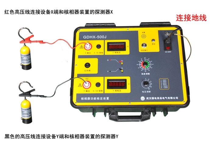 首先我们将红色高压线连接设备X端和核相器装置的探测器X,黑色的高压线Y端连接核相器装置的探测器Y,最后连接设备的电源线,连接好的核相器X,Y整齐放在绝缘地板上,我们会搭配核相器组合使用的接受主机来测试,