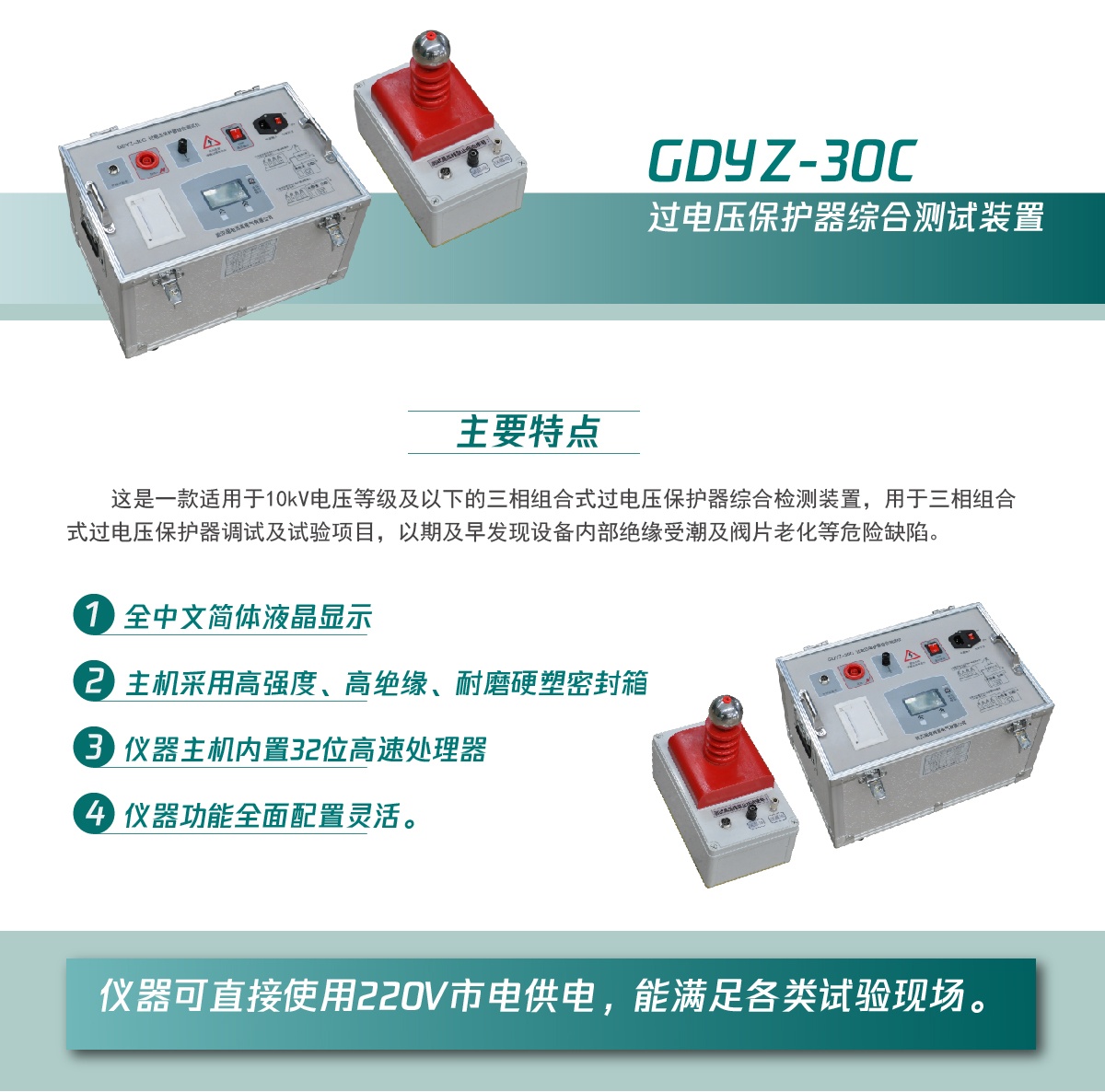 GDYZ-30C过电压保护器综合测试装置作为电力系统中一种新型过电压保护装置,三相组合式过电压保护器已大量应用于35kV及以下电力系统中,用以限制雷电过电压、真空断路器操作过电压以及电力系统中可能出现的各种暂态过电压,可有效地保护电动机、变压器、开关、电容器、电缆、母线等电力设备的绝缘不受损害,对相间和相对地的过电压均能起到可靠的限制作用,是传统的避雷器所不具备的。